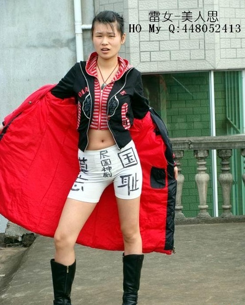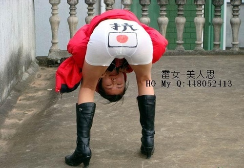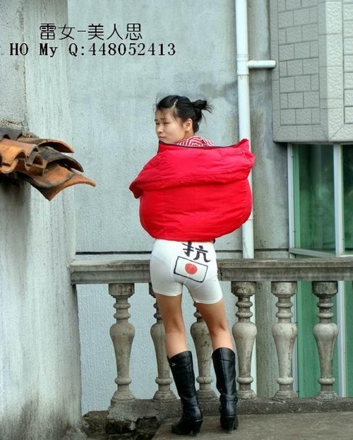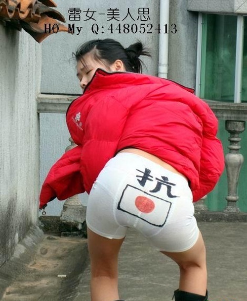 중국 고등학생으로 추정되는 문제의 이 여성은 흰색 속옷과 자신의 몸을 이용해 누드퍼포먼스를 능가하는 이색 항일시위를 펼쳤다. 다리를 벌리고 엉덩이를 내민 부분에 이 여성은 일장기를 그려넣어 '항일'(抗日)의 의미를 담았다.